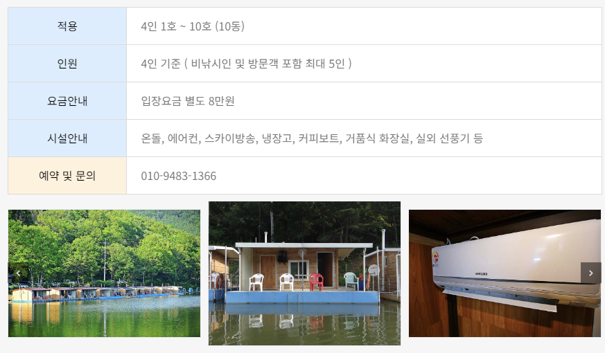 - 수상 방가로 (입실 9시 ~ 퇴실 4시) 2~3인 : 5만 원 / 4~5인 : 8만 원 / 6~7인 : 10만 원